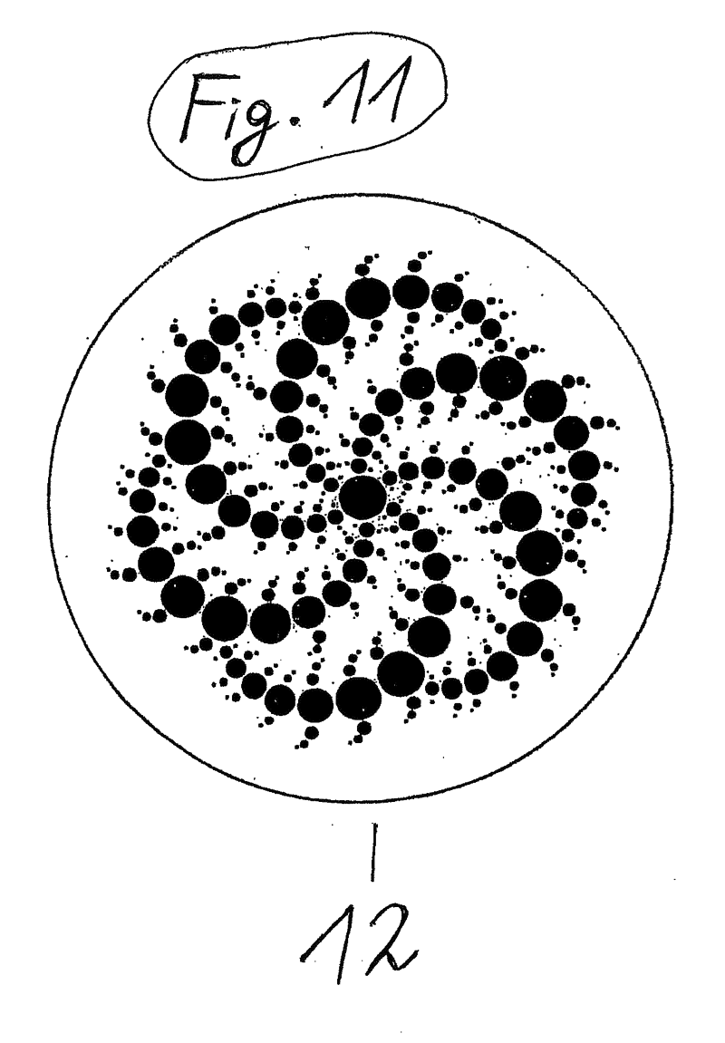 [0004] Nachdem Flüssigkeiten u./o. Flüssigkeits-Feststoff-Gemische u./o. Dämpfe u/o. Gase in die Misch- u./o. Verwirbelungsvorrichtung eingeflossen sind, treffen sie auf eine Durchström-platte, die auf spezielle Weise mit Löchern versehen wurde. Es lassen sich durch den möglichen Einsatz unterschiedlicher Durchströmplatten die Misch- u./o. Verwirbelungsabläufe variieren, um ganz unterschiedliche Effekte und Ergebnisse erzielen zu können. Obwohl die unterschiedlichen Durchströmplatten sich voneinander unterscheiden , weist die Konstruktion der aufgeprägten Löcher u./o. Lochformationen auf diesen Durchströmplatten folgende Merkmale auf:
