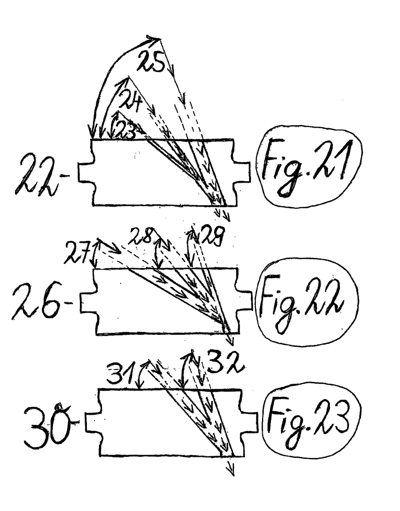 [0006] Die Misch- u./o. Verwirbelungsvorrichtung u. –verfahren ist ebenso geeignet zum intensiven und kosteneffizienten Vermischen unterschiedlicher Substanzen. Hierzu leitet man in die einzelnen Löcher der Durchströmplatten die zu mischenden Substanzen, wiederum Flüssigkeiten u./o. Flüssigkeits-Feststoff-Gemische u./o. Dämpfe u./o. Gase. Man kann durch die Wahl der Lochgrößen und die Menge der eingeleiteten Substanz die Strömungs-geschwindigkeiten steuern. Die Austrittspunkte aus einer Durchströmplatte lassen sich ebenfalls genau festlegen. Will man zwei Substanzen miteinander vermischen, wird z.B. die Substanz A in ein Durchströmloch A geleitet und die Substanz B in ein Durchströmloch B. Man würde dann die Austrittspunkte von Durchströmloch A und Durchströmloch B nahe aneinander legen, so dass es zu einer lokalen Vermischung u./o. Verwirbelung kommt. Will man nur zwei Substanzen vermischen, wiederholt man das gleiche Prinzip viele Male auf einer Durchströmplatte und erreicht damit viele lokale Vermischungen u./o. Verwirbelungen der beiden Substanzen sowie eine Vermischung u./o. Verwirbelung der vielen einzelnen Lokalvermischungen u./o. Verwirbelungen untereinander und ineinander in einer großen Gesamtvermischung u./o. Gesamtverwirbelung. Man hat dadurch die beiden Substanzen auf intensive und kosteneffiziente Weise miteinander vermischt u./o. verwirbelt. Ein weiterer Vorteil eines derartigen Vermischungs- u./o. Verwirbelungsverfahrens ist, dass sich sehr komplexe