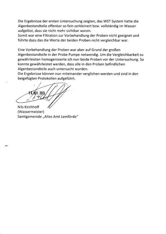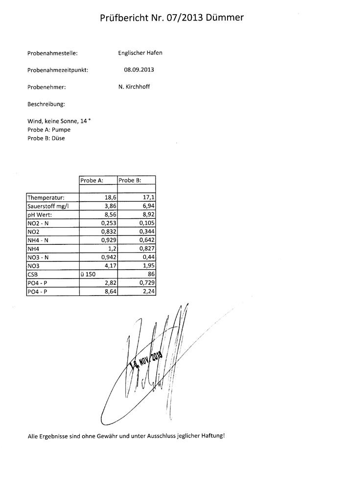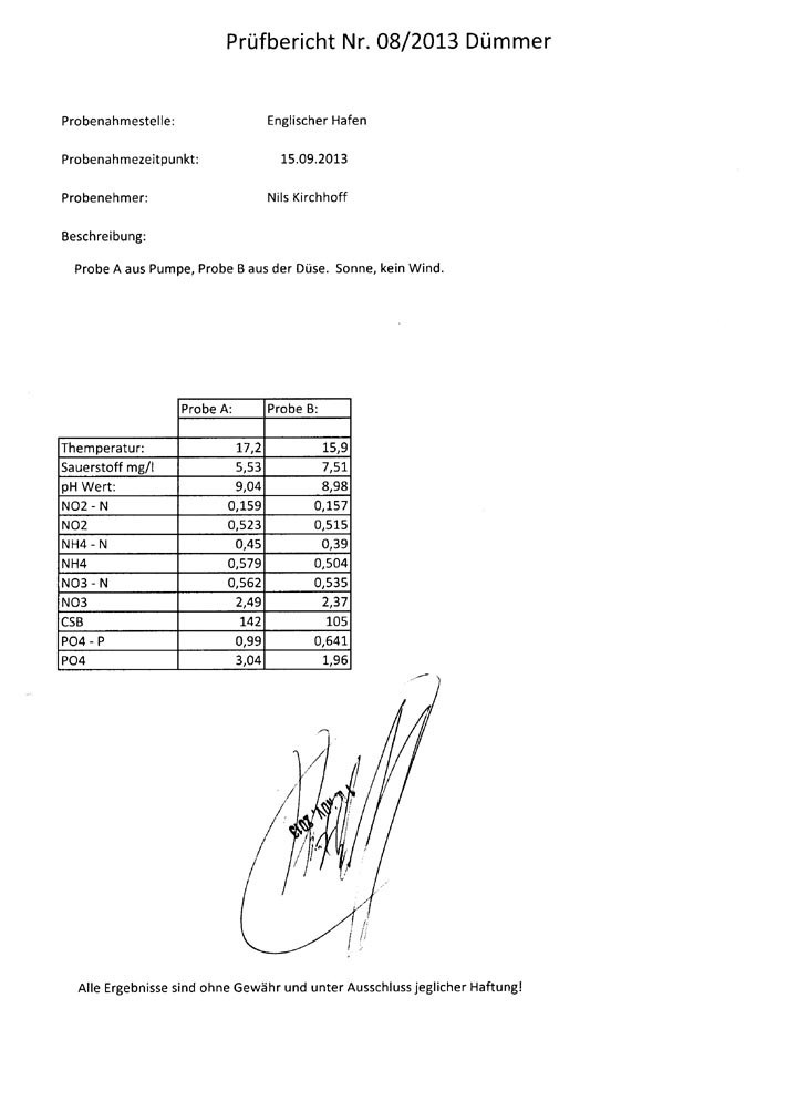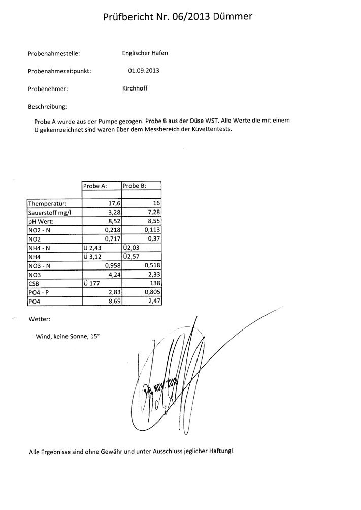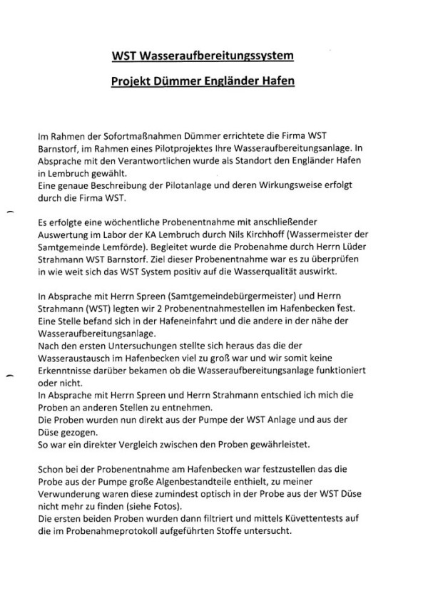 Abschlussbericht von Nils Kirchhoff (Wassermeister bei der Samtgemeinde Lemförde), der für das WST-Pilotprojekt am Engländer Hafen (Dümmersee) tätig wurde im Auftrag von Herrn Spreen (Samtgemeindebürgermeister Lemförde) und zuständig war für die Probenentnahmen und -auswertungen.